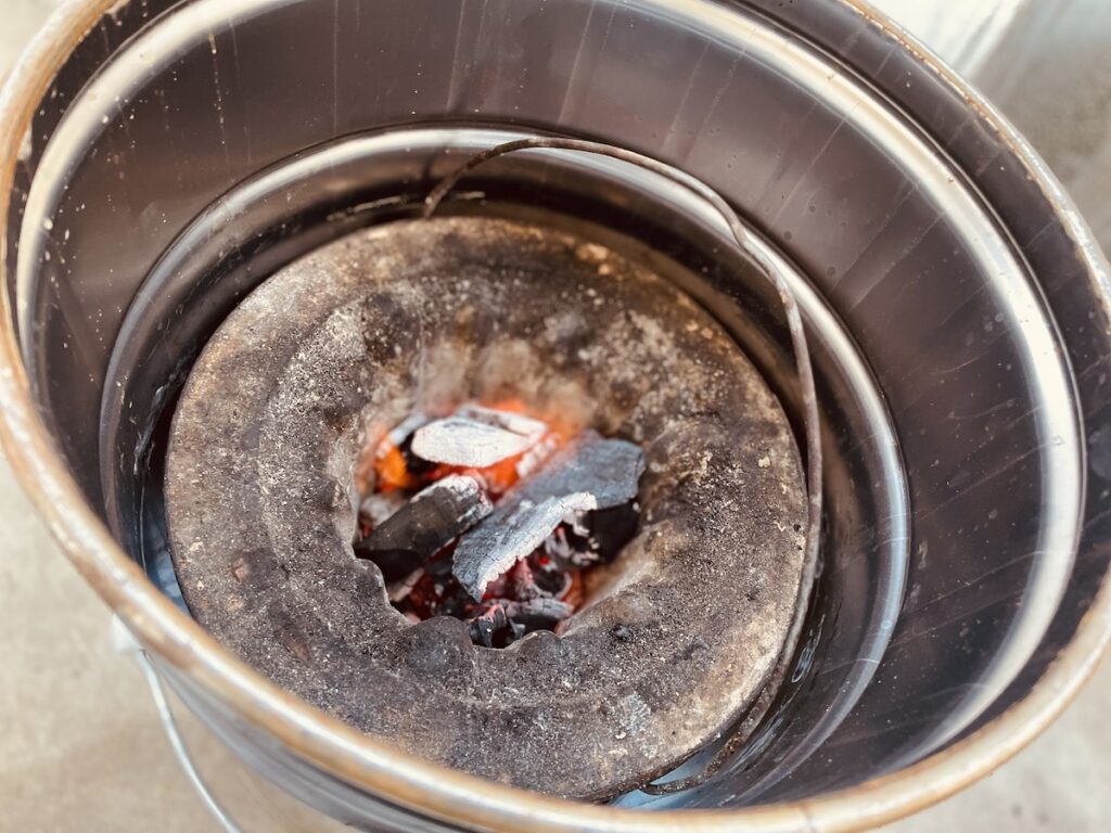 ホームセンターで売られている安価な炭で十分ですが、火持ちがよく煙が少ない備長炭を使うとさらに快適です。